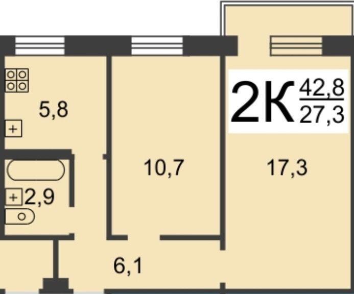 Общая площадь квартиры - 42,8 кв.м.